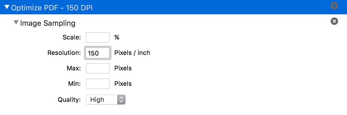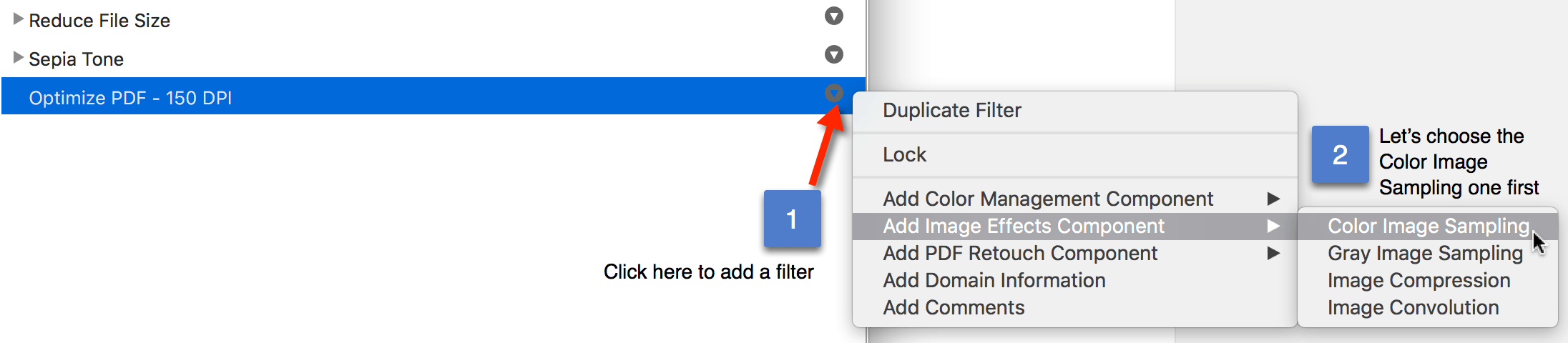 Step 2: Add in the filters that you want to be applied on to the PDF document. Firstly, let’s add a Color Image Sampling filter and set the downsampling to 150 DPI.